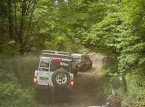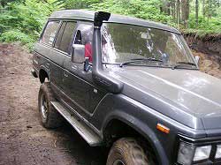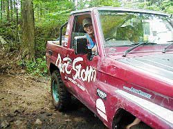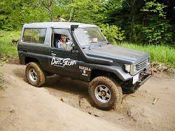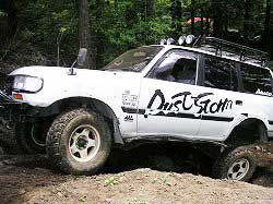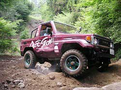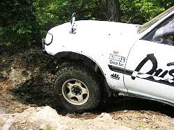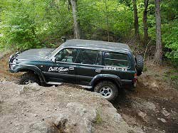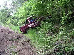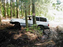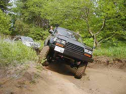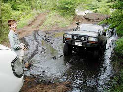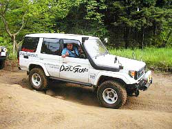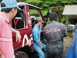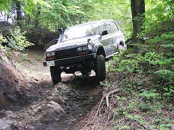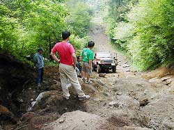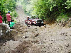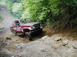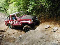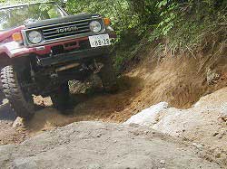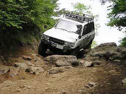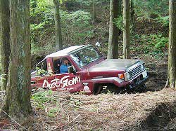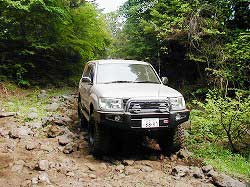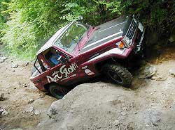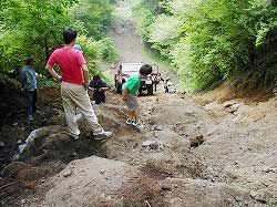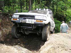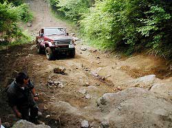| 左フロント・タイヤが引っかかって進めません。 | 行けないときは、必ず降りて確認! これが車を壊さない一番の方法ですよね〜。 |