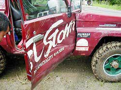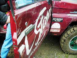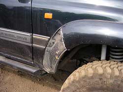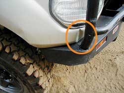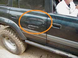 | あきら君、ドアにもえくぼが…。 | ささはらさんも! 頑丈な“ARBバンパーを曲げる男”へ仲間入り! |