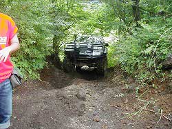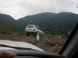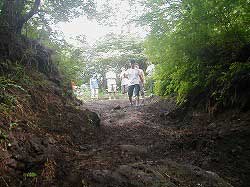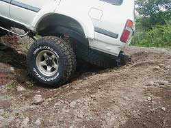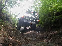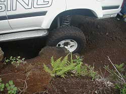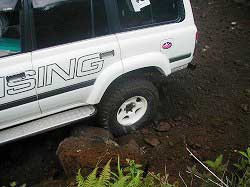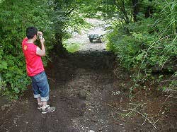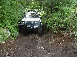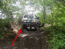 ゆるやかに左にカーブしていきます。 | 右リヤ・タイヤが深みにはまっています。 |