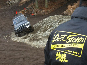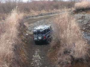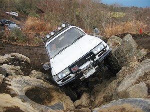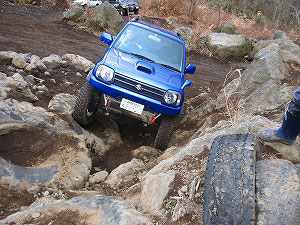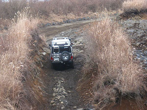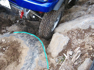 | コース・インの段階で、 バンパーと岩がゴッツンこ。 後ろの道幅が狭く、 切り替えしが結構大変。 |