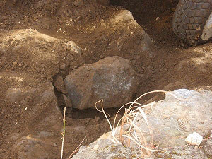 | ちなみに、これは あきら君の助手席側のフロント・タイヤに 掘り出された岩。 |