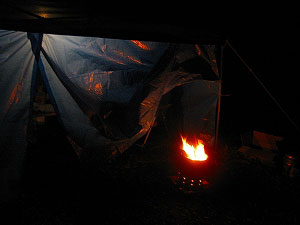 煙がすごくてタープの中に入れられず…。