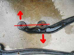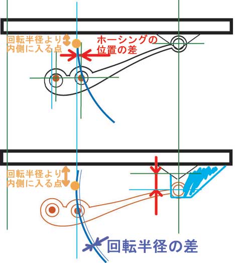 | 上がブッシュによる補正。下がダウンブラケットによる補正。 この考えでいくと、ホーシングの位置も若干変わるような 気がしてて…。 |