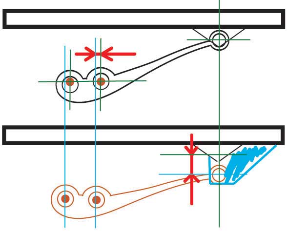 また、リーディングアームの支点が変わり、 バネの負担が大きくなるような気がして…。 (ここまでバネが縮むことはありません。 あくまで考え方の図ですからね。) |