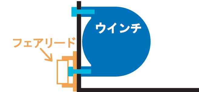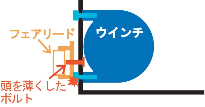 | ということで、ウインチ固定用の下のボルトと フェアリード固定用のボルトを兼用しました。 |