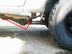 Aブラケット装着の際、ミッション・メンバーをジャッキで支えておく。