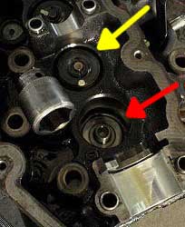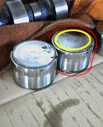 | 赤の部分がタペット。 黄の部分がシム。 シムの厚さでバルブ・クリアランスを 調整するんですよね。 |