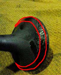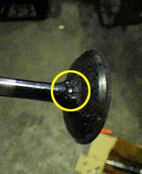 | 赤の部分がバルブ・フェース。 | ココがきちっと閉じることで 燃焼室の圧縮を維持するんだけど…。 当たり面がボコボコ…。 本来は、銀ピカに光輝いてないと いけないんですよね〜。 |