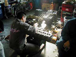 シリンダ・ヘッドをきれいにしている松永さん。