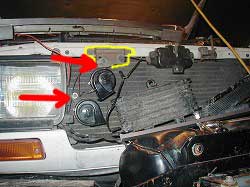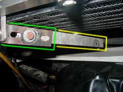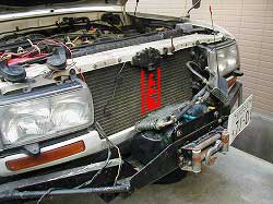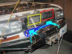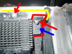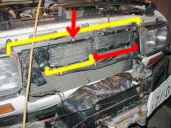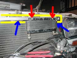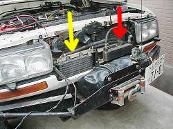 | 今までは、この状態で各クーラーが 設置してありました。 黄矢印がパワステ・クーラー。 赤矢印がATFクーラー。 |