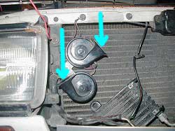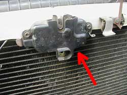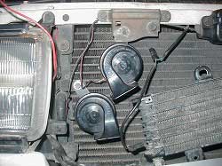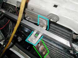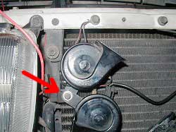 | ホーン固定用ステーから、 パワステ・クーラーの 下側の穴を固定しました。 |