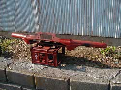 | ウインチ・ベッドの両側にパイプが付くため、 「いっそのこと囲ってしまおう!」 ということで、赤部分を溶接しました。 これでかなりウインチ・ベッドは強くなりましたね〜。 |