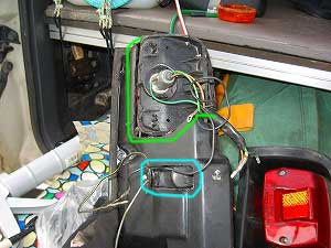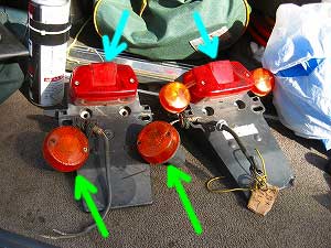| 使うものは水色矢印のテール・ランプと、 黄緑矢印のウインカー。 |