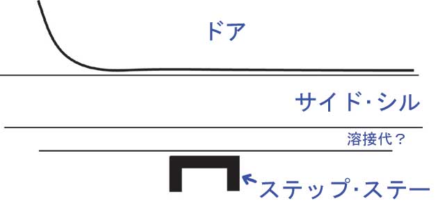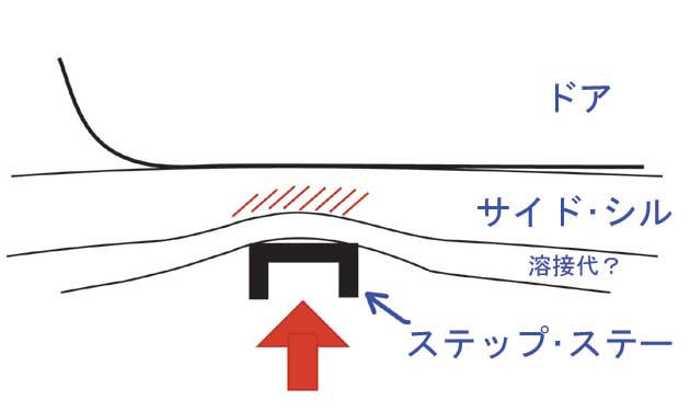 | いろんなものに乗り上げてしまうと ステップ・ステーが曲がってきて サイド・シルが下から突き上げを受けます。 結果、ステップ・ステーのある箇所の |