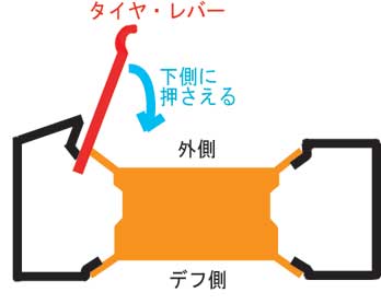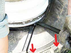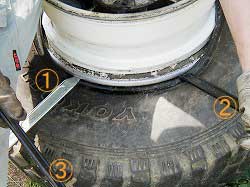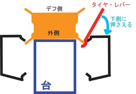 | こんな感じで…。 | 作業しているおいらから見るとこんな感じ。 タイヤを下に押さえる方向に力を入れます。 |