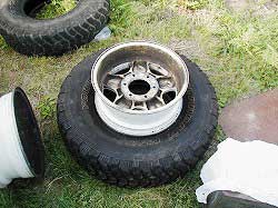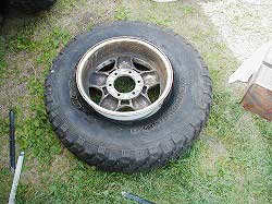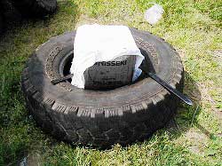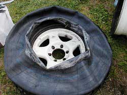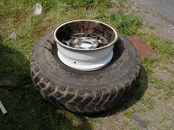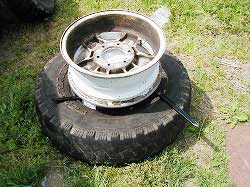 | こんな感じでビードを落としました。 重ねてあるタイヤは、ビードを落とそうとしているタイヤが 斜めになるのを押さえるために入れてあります。 |