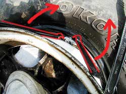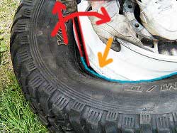 タイヤ・レバーでタイヤを拡げながら、 かつレバーを上に引き上げるような感じで やるとうまくいきます。(赤矢印のように) 水色ラインはタイヤの内側のラインです。 |