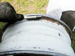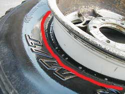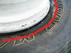 | タイヤとホイールの合わせ面(赤い部分)に石けん水を塗りました。 | |