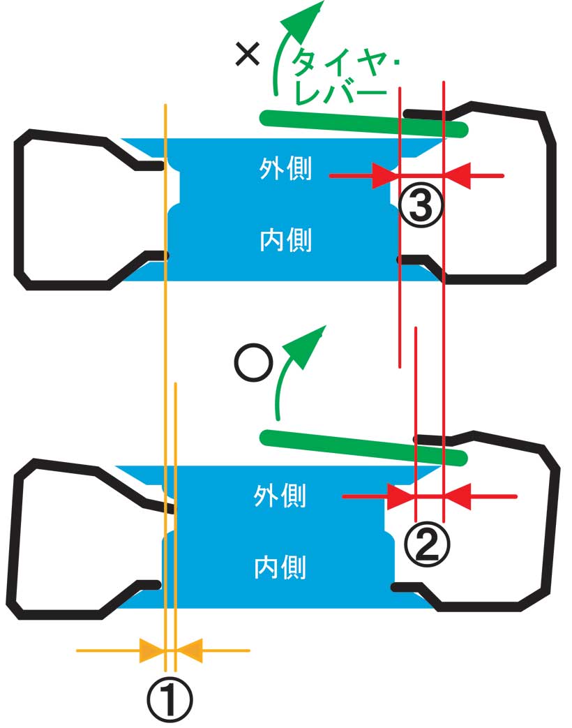 上が失敗したとき、下が成功したときの状況。 図の左側の黄線の差@がポイントです。 ホイールの深いところにきちんと落としていませんでした。 下のようにホイールの深いところにおとすことによって |