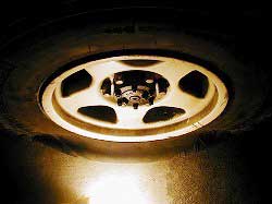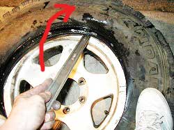 | ホイールに傷が付かないようにプラスチック製の 板をあてがいます。形が妙なのは意味はなく、 部屋に転がっていたのをそのまま使っただけだからです。 |
