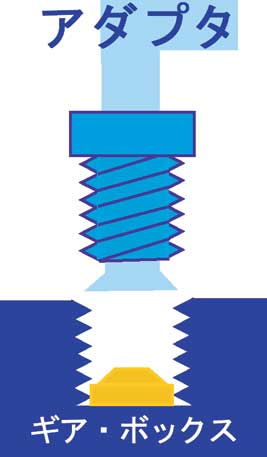 | 黄色のテーパ・ワッシャの斜めの部分と アダプタの水色のパイプの内側がきちんと 合うように位置を確認しながら締めた。 |