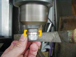 | ボルトでテーパー・ワッシャ(黄色の部分)を押さえます。 これをボール盤で廻し、やすりを当てて削ります。 |